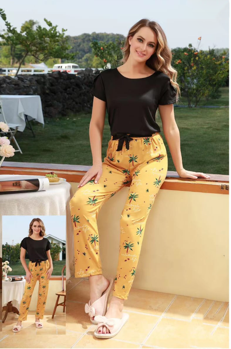 Crafted from premium-quality Turkish fabric, this imported set blends a sleek black tee with playful, palm-patterned trousers, creating a perfect harmony of chic fashion and absolute coziness. Whether you’re unwinding at home after a long day or stepping out for a casual outing, this versatile piece ensures you’re always effortlessly stylish.